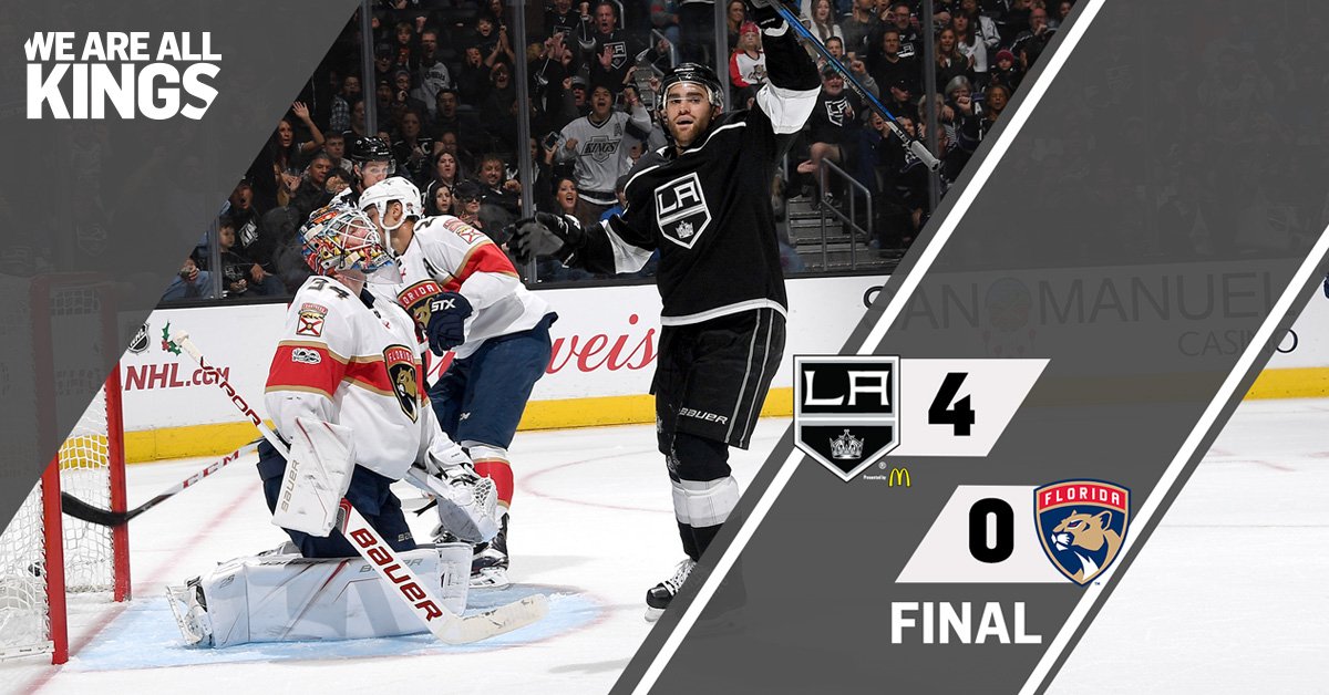 At 2:22 in the 3rd the Kings scored to make it 2-0, the goal was scored by number 17 Jonny Brodzinski. It was his first ever NHL career goal. Then at 15:19 the Kings made it 3-0: the goal was scored by number 15 Andy Andreoff, it was his (1st goal,of the game and season). At 17:07 the Kings scored again to finish the Panthers off by making it a 4-0 game. The goal was scored by number 22 Trevor Lewis, it was his (1st goal of the game and 5th of the season).